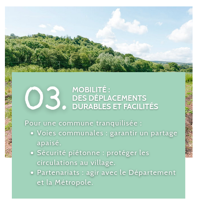Enfin, chaque réflexion sur la mobilité intégrera les enjeux environnementaux et la préservation du patrimoine naturel, afin de préserver la tranquillité et la qualité de vie du village.