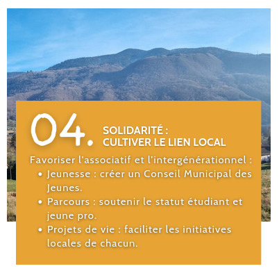 Nous souhaitons également faciliter les projets de vie locale, qu’ils soient culturels, solidaires, sociaux ou liés à la santé. Le rôle de la municipalité est d’accompagner, de mettre en relation et de lever les freins lorsque c’est possible.